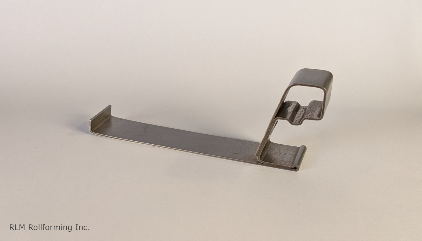 Swept automotive B-Pillar inner. Produced on an RLM manufacturing system with a precision in-line sweep and a servo flying cutoff system with precise radius tracking.